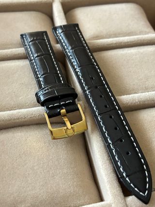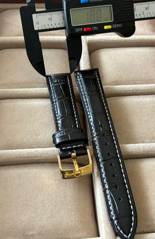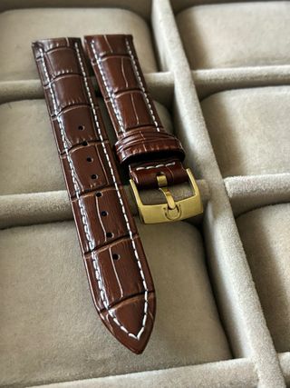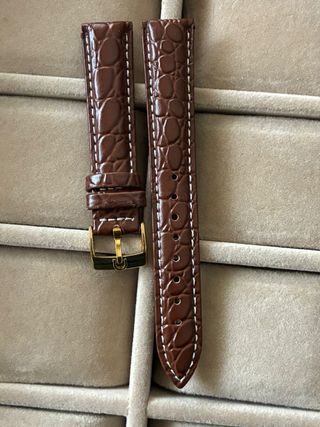 Correa de reloj de 18mm. - Material: Piel de becerro con patrón de cocodrilo. - Costuras blancas. - Hebilla de acero en oro Entrego o envío con 3 pasadores