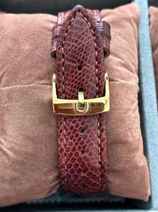 Elegante reloj Omega con caja dorada y correa de cuero roja tres correas negra y maron omega la negra original - Diseño automático. - Esfera dorada con detalles. - Ventana de fecha. - Fabricado en Suiza.