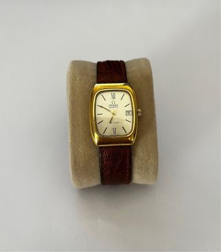 Elegante reloj Omega De Ville con caja dorada y correa de piel marrón. - Modelo: Ref. 592.0001 - Esfera de color crema con índices romanos. - Ventana de fecha a las 3 en punto. - Correa de piel con textura. - Cierre de hebilla original Omega. El reloj necesita revisión.