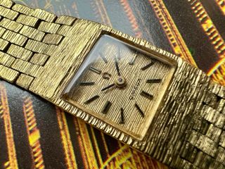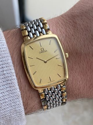 Precioso reloj Vintage Omega de 15mm de caja y chapado con 20 micras de oro, remonte manual, en muy buen estado y funcionando correctamente. Elegante y clásico con caja rectangular, esfera texturizada dorada. El brazalete integrado fue fabricado en inglaterra y presenta un acabado texturizado. El brazalete por su parte trasera presenta algunos signos de desgaste. Ideal para amantes de piezas vintage auténticas. Este reloj es un símbolo de la alta relojería tradicional. Una pieza fina y femenina. Precio Negociable