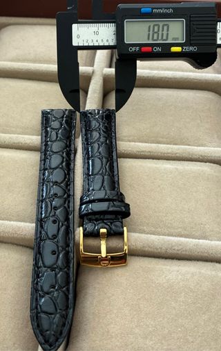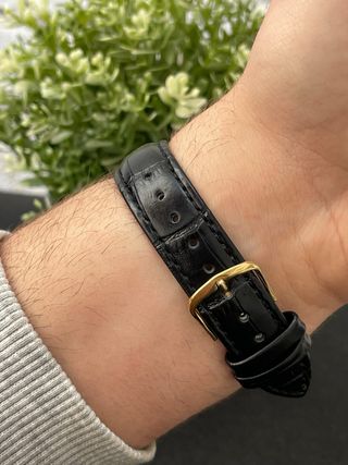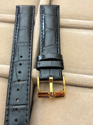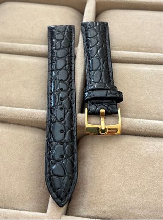 Correa de reloj en piel de becerro negra con elegante acabado texturizado de Cocodrilo - Material: Piel de becerro - Costuras blancas. - Hebilla en acero oro - Medidas : 18 mm - Incluye pasadores nuevos Reloj vintage