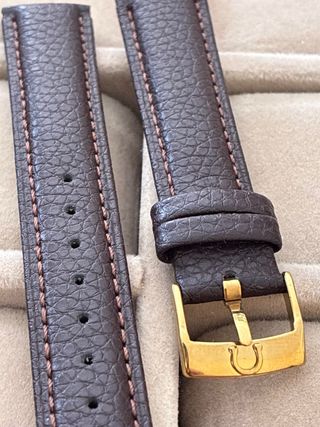 Correa de piel de becerro para reloj de la marca Omega. Presenta un diseño clásico y elegante. - Color marrón con pespuntes a tono. - Hebilla de metal dorada con el logo de Omega. En acero oro - Ancho 18mm - Entrego o envío con 3 pasadores de recambio Reloj Vintage MO18RUGomg-AU