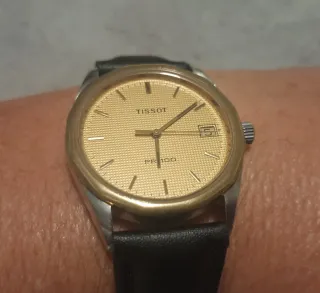 Reloj Tissot PR 100 con una combinación de colores oro y plata, con un diseño clásico de los años 80. - Esfera con acabado texturizado. - Ventana de fecha a las 3. - Brazalete de acero inoxidable original, más una correa de piel negra. - Cristal Zafiro - Corona enroscable - 100 metros 333 feet - Movimiento de cuarzo suizo - Adquirido en Suiza
