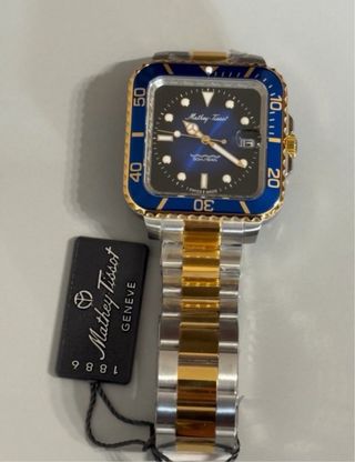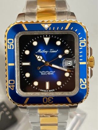 VALORADO EN 390 EUROS pido 340 negociables, caja y papeles originales Elegante reloj Mathey-Tissot 42mm de estilo diver con detalles en oro de 18 quilates y esfera azul, fabricado en Suiza. Completamente nuevo con caja, papeles y garantía original 2025. - Bisel giratorio unidireccional azul y dorado. - Indicador de fecha a las 3. - Resistencia al agua de 100m/330ft. - Fabricado en Suiza.