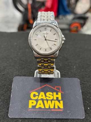 Elegante reloj Tissot con detalles en oro y plata. - Esfera blanca con números romanos. - Ventana de fecha. - Brazalete de eslabones combinados. Se vende con caja original