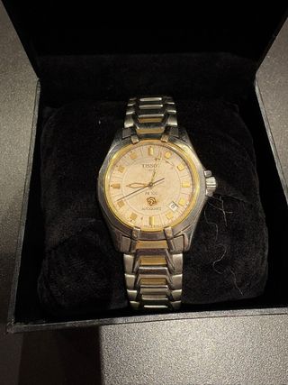 Elegante reloj Tissot con detalles en oro y plata. - Mecanismo de cuarzo. - Diseño clásico y versátil.funciona bien viene con caja jaguar. Es un reloj para chicas o para mujeres. No negociable