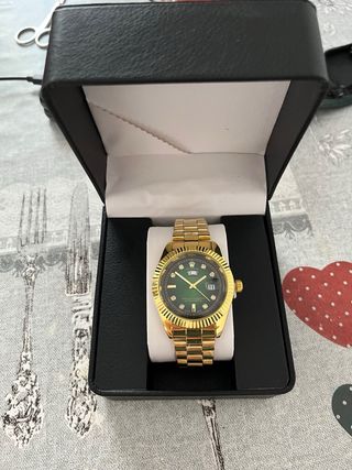 Elegante reloj copia con caja y brazalete en tono dorado. La esfera de color verde presenta detalles de diamantes. - Caja y brazalete de oro. - Esfera verde con marcadores de diamantes.