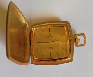 Reloj de bolsillo de cuerda manual, de caja cuadrada chapado en oro, con su leotina. Medidas: 4cmX4 cm. Perfecto funcionamiento.