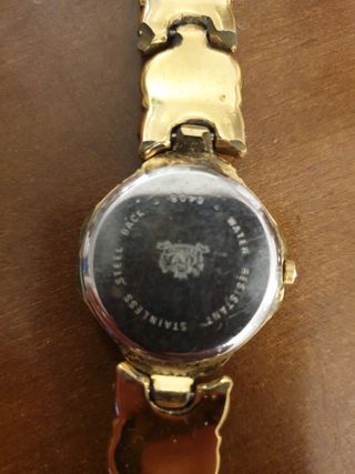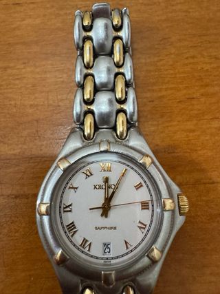 Elegante reloj con un diseño moderno y sofisticado. Falta el botón, hay que arreglarlo, pero el reloj funciona. - Combinación de colores oro y plata. - Esfera con números romanos y detalles brillantes. - Indicador de día y fecha.