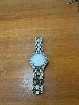 Elegante reloj de pulsera con un diseño bicolor. - Combinación de tonos dorados y plateados. - Esfera con detalles brillantes.