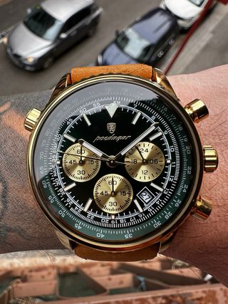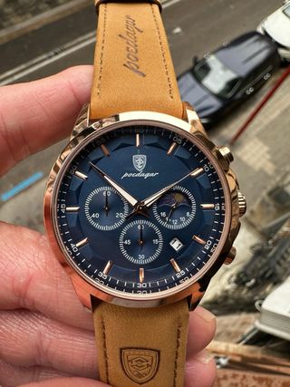Reloj Poedagar de cuarzo con diseño cronógrafo y acabados en oro rosa, una combinación sofisticada que aporta presencia y carácter sin perder elegancia. Ideal para quienes buscan un reloj con estilo distinguido y personalidad. Características principales: • Movimiento Quartz preciso y fiable • Caja metálica en acabado oro rosa pulido • Esfera azul profunda con subesferas funcionales • Función cronógrafo y ventana de fecha • Correa tipo cuero en tono marrón, cómoda y resistente • Diseño equilibrado entre lo clásico y lo moderno Reloj nuevo, sin uso y en excelente estado. Una pieza llamativa y refinada, perfecta tanto para el