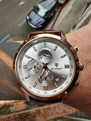 Reloj Poedagar con diseño sofisticado y presencia elegante. Combina una caja en tono oro rosa, esfera plateada de acabado refinado y correa de cuero marrón, creando un conjunto equilibrado y claramente premium. Un modelo pensado para quien busca distinción, ideal tanto para vestir como para uso diario cuidado. Características destacadas: • Movimiento de cuarzo preciso y fiable • Diseño cronógrafo con subesferas funcionales • Indicador decorativo día/noche • Bisel con escala taquímetro • Caja metálica acabado oro rosa • Correa de cuero cómoda y elegante • Índices aplicados y agujas pulidas • Cristal resistente • Estética c