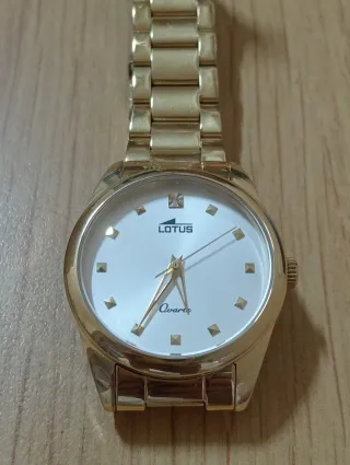 Elegante reloj Lotus chapado en oro, con una esfera blanca y detalles dorados. Se encuentra en perfecto estado y ha tenido muy poco uso.NO SE ACEPTA DEVOLUCIÓN - Diseño clásico y atemporal. - Acabado brillante del chapado en oro.
