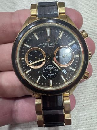 Reloj Jacques Lemans Eco Power con funcionamiento solar. - Esfera con detalles en dorado. - Correa combinada en oro y madera oscura. - Indicador de Solar y Wood en la esfera.