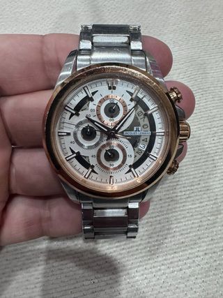 Reloj cronógrafo de cuarzo, fabricado en acero inoxidable, con bisel en tono oro rosa y calendario. ✔ Movimiento suizo de cuarzo ✔ Cronógrafo funcional ✔ Resistencia al agua 10 ATM ✔ Funciona correctamente ✔ Estado bueno, con marcas normales de uso (ver fotos) ✖ Sin caja ni documentación Reloj de marca europea reconocida, calidad superior a relojes de moda.