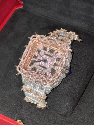 Elegante reloj Cartier Santos con incrustaciones VVS. - Bisel y brazalete cubiertos de diamantes. - Esfera con números romanos y detalles en árabe. - Combinación de oro y plata en el diseño.