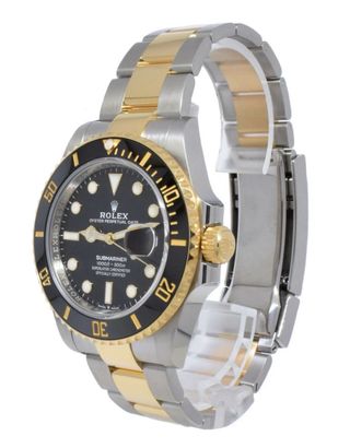 Reloj Rolex Submariner Date con esfera negra y detalles en oro. Modelo de 2023, se entrega con su set completo. - Bisel giratorio unidireccional. - Ventana de fecha con lupa. - Brazalete Oyster de acero y oro.