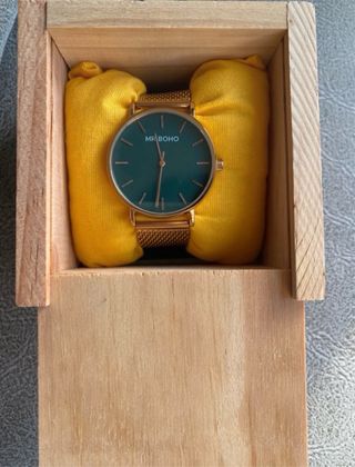 Elegante reloj MR. BOHO con una esfera verde y detalles dorados. Presentado en una caja de madera. - Diseño moderno y minimalista. - Correa de malla dorada ajustable. - Pila recién cambiada