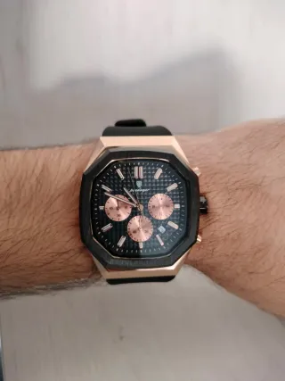 Elegante reloj Poedagar con un diseño moderno y sofisticado. - Caja octogonal con bisel en oro rosa. - Esfera negra texturizada. - Tres subesferas para cronógrafo. - Detalles en oro rosa en la esfera y pulsadores.