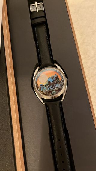 Reloj de diseño hecho a mano en Londres en 2025. Diseño por el artista Paul Wardski, “Silver Moon Over Cuilin Skye.” El reloj es una edicion limitada solo estuvo a la venta durante 24h, es el numero 105 como viene indicado en la parte trasera. El sol esta bañado en oro de 23.5 quilates y la luna en paladio resplandeciente. Viene con caja y documentos originales asi como su correa de cuero negra original que nunca ha sido usada, esta en garantia. Diametro: 37mm Lug to lug: 46.9mm Ancho correa: 18mm