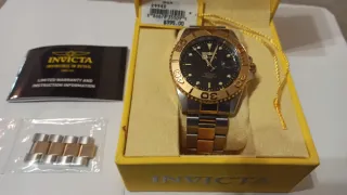 Reloj Invicta Pro Diver con detalles en color oro y plata. Incluye caja original, manual de garantía y eslabones extra. - Bisel giratorio unidireccional. - Resistencia al agua. - Cierre de seguridad.