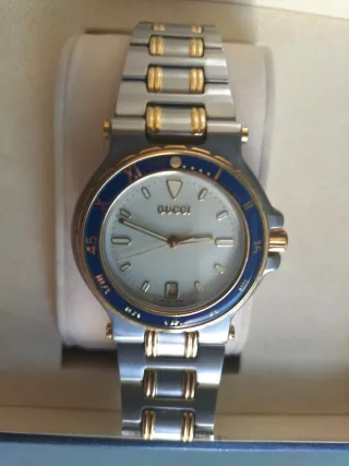 Elegante reloj Gucci con detalles chapados en oro y plata. Un accesorio sofisticado para cualquier ocasión. - Diseño bicolor con acabado brillante. - Bisel azul y detalles dorados en la esfera. - Correa de eslabones combinando plata y oro.