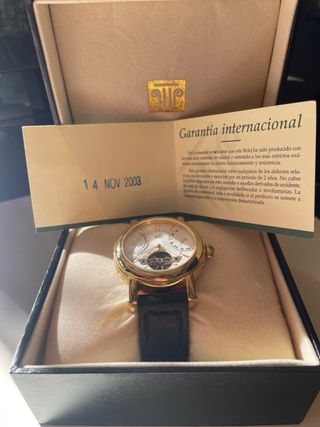 REBAJADO HASTA EL 15 de Enero. Estaba por 225€ que será su precio si no se ha vendido antes del 15 de Enero. Caja: de acero inoxidable bañada en oro Esfera: grabada con numeros arabigos en dorado estilo Art Deco, con cristal frontal y posterior reforzado Movimiento: mecanico de carga automatica Funciones: dispone de un indicador de dia retrogrado a las 2h. de un indicador de fecha retrogrado a las 10 y de un volante de marcha abierto estilo tourbillon a las 6h. Resistente al agua y profundidades de hasta 50 metros. Correa: de cuero genuino con cierre de mariposa Edicion numerada y limitada a 998 unidades.