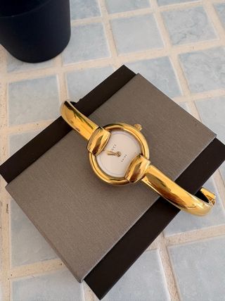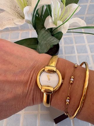 Elegante reloj de pulsera con un diseño clásico y sofisticado de la marca Gucci chapado en oro. Water resistant. Pila recirn cambiada. - Esfera redonda de color blanco. - Brazalete rígido de estilo bangle.