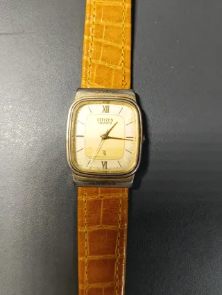 Elegante reloj Citizen Quartz con correa de piel. -Chapado en Oro - Esfera dorada con números romanos. - Correa de piel marrón con acabado texturizado. - Diseño clásico y atemporal.