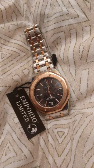 Elegante reloj de la marca Emporio con un diseño moderno y llamativo. - Combinación de colores oro y verde. - Correa de material resistente.