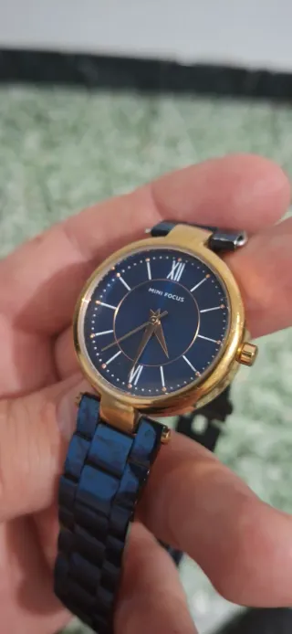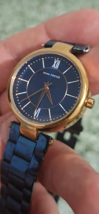 Elegante reloj de la marca Mini Focus con un diseño moderno. En perfecto estado de funcionamiento y estéticamente. - Esfera azul con detalles dorados. - Correa de eslabones en tono azul y dorado. - Bisel y detalles en oro.