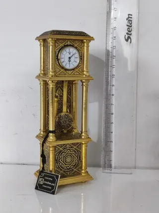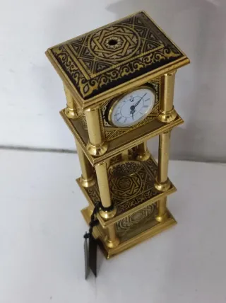 Elegante reloj de sobremesa con un intrincado diseño damasquinado en oro de 24 quilates. - Detalles en oro de 24 quilates. - Diseño damasquinado de Toledo. - Fabricado por Credan SA. - Madre in Spain El reloj se encuentra actualmente parado. Una de las patas está reparada