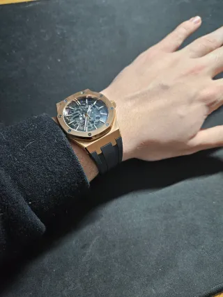Reloj Seiko con movimiento NH72-A skeleton. Caja octogonal estilo AP oro rosado y correa de caucho negra - Movimiento mecánico automático NH72-A - Esfera abierta que muestra la maquinaria. Detalles en los bordes estilo galaxia. Agujas e índices horarios con lumen. - Caja acero inoxidable 316L con baño en oro rosado 41 mm atornillada. Fácil mantenimiento. - Correa de caucho con múltiples ajustes. Sistema de pines atornillados. Fácil cambio.