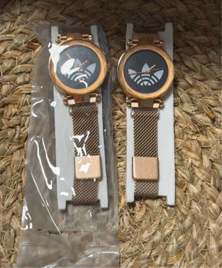 Par de relojes con esfera negra y detalles dorados. - Diseño moderno con logo de Adidas. - Correa tipo malla metálica. - Cierre ajustable con imán. - se vende unidad.