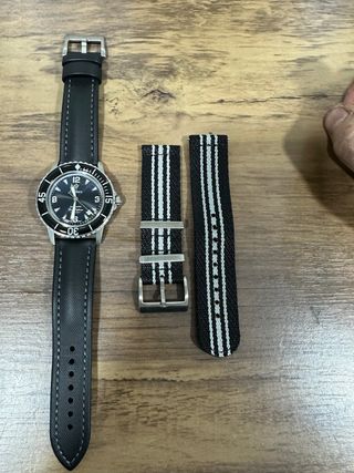 Reloj automático Cadisen con un diseño inspirado en el estilo Blancpain Fifty Fathoms. Incluye dos correas adicionales. - Correa de cuero negra con pespuntes. - Correa tipo NATO a rayas blancas y negras. - Correa tipo NATO a rayas blancas y negras con hebilla. -Calibre Miyota , con parada de segundero.