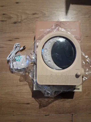 Reloj despertador con un diseño inspirado en la luna. - precio por ambos - Acabado en madera clara. - Forma de arco. - Altavoz integrado.