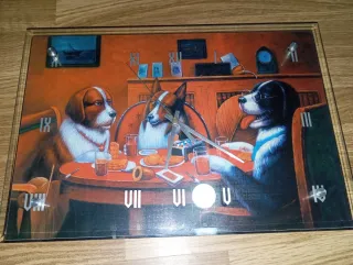 Reloj de pared con una divertida ilustración de perros. No funciona le he puesto una pila y no hace nada - Diseño original con perros sentados a una mesa. - Marco de madera y cristal