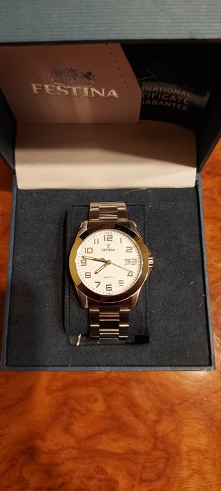 Reloj Festina de pulsera como nuevo, usado solo en un par de ocasiones. Es de titanio. Tiene recuadro con el día del mes. Viene con caja original, piezas para ensanchar la pulsera y certificado de garantía de origen.