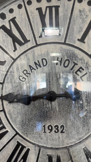 Elegante reloj de pared con un diseño clásico. - Esfera con números dorados. - Detalle decorativo central. - Inscripción Grand Hotel London.