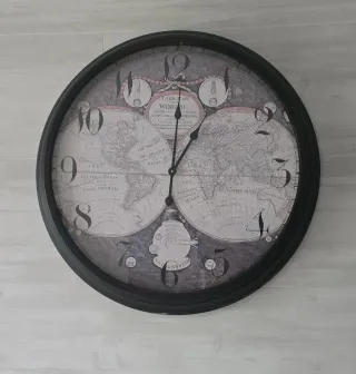 Este reloj de pared grande presenta un diseño de mapa del mundo detallado. - Marco negro. - Esfera multicolor con mapa. - Diseño clásico.