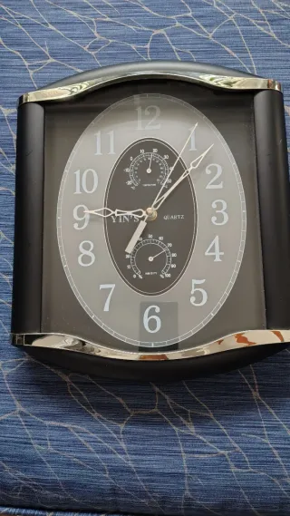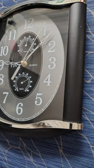 Reloj de pared con un diseño moderno y elegante, ideal para cualquier estancia. Incorpora indicadores de temperatura y humedad. - Marco en color negro con detalles plateados. - Esfera con números grandes y fáciles de leer. - Incluye un pequeño termómetro y un higrómetro integrados.