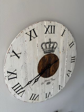 Precioso reloj de pared de estilo vintage. Tiene una estética desgastada que le da un toque único. - Marco blanco de madera. - Esfera con números grandes y diseño envejecido. - Ideal para decorar cualquier espacio con un toque retro.