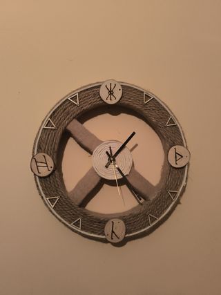 Preciosa pieza única. Se trata de un reloj de pared hecho a mano con cuerdas de aspecto rústico. - Diseño náutico con cuerdas beige y marrón. - Numeración visible y clara. - Ideal para decoración de interiores.