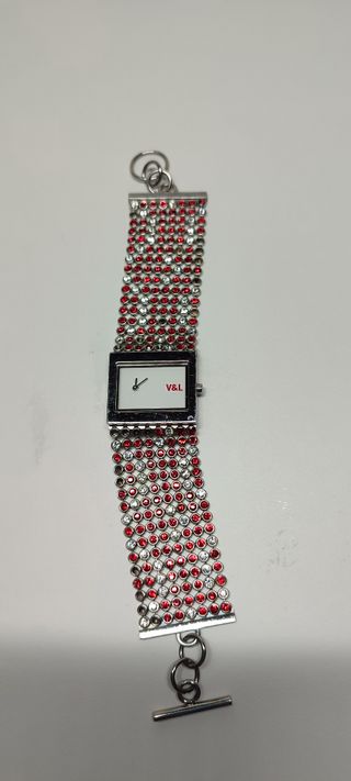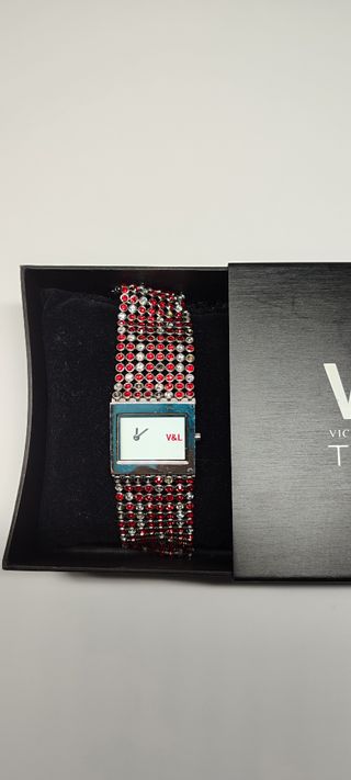 Reloj de vestir de la firma Victorio y Lucchino con brillantes rojos y blancos. Le faltan un par de brillantes, pero casi no se nota y hay que cambiarle la pila. Por lo demás está en perfectas condiciones y se entrega con su caja original y certificado de autenticidad