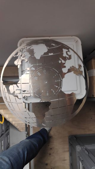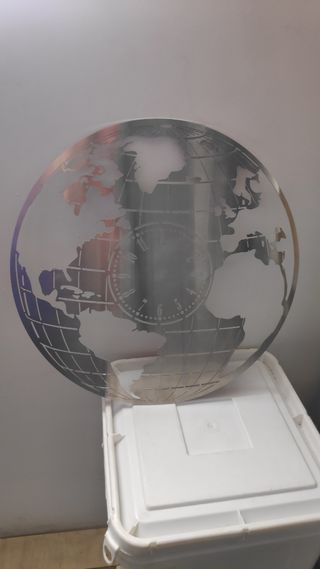 Elegante reloj de pared con diseño de globo terráqueo. - Fabricado en acero inoxidable. - Acabado plateado. - Falta mecanismo