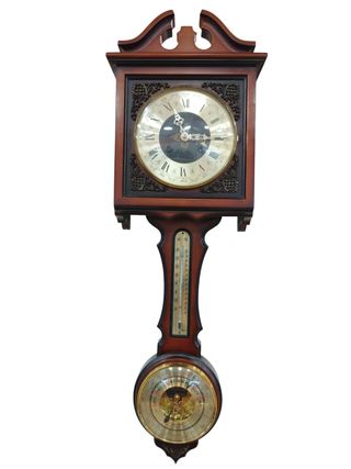 Este reloj de pared combina funcionalidad y un diseño clásico. Su estructura de madera oscura está adornada con detalles blancos que le dan un toque elegante. - Incluye reloj, termómetro y barómetro. - Esfera dorada con números romanos. - Adornos decorativos blancos.
