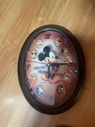 Reloj de pared con diseño de Mickey Mouse y sus amigos. - Marco ovalado. - Personajes de Disney. - Esfera con números. Tiene algún desperfecto como se aprecia en las fotos, funcionando.