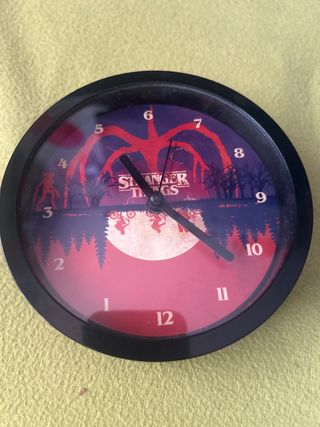 Reloj de pared con diseño de Stranger Things. - Marco negro. - Esfera con motivos de la serie. No viene con pila, y lo vendo porque nunca supe usarlo 😅