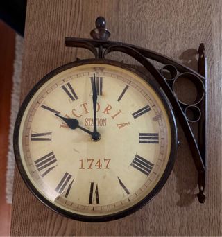 Elegante reloj de estación con un diseño clásico. - Estructura metálica en tonos marrones y dorados. - Esfera con números romanos. - Inscripción Victoria Station 1747. - Esfera 20cm de diametro