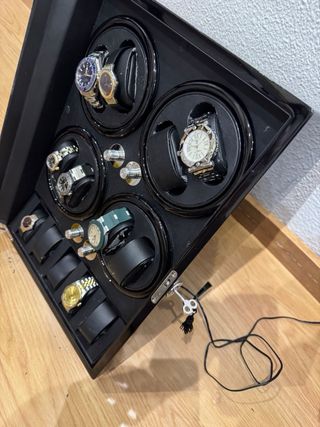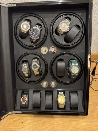 Caja para relojes con capacidad para 8 unidades en movimiento y 5 en parada, ideal para mantenerlos en movimiento. Cuenta con 5 programas de rotación. Caja Winder Perfecto Funcionamiento 8 Relojes En Movimiento Motores En Perfecto Estado y Funcionamiento 5 Relojes En Parada Puerta Con Crista y Llave Ideal para coleccionistas ya que es un buen accesorio para que estén tus relojes en movimiento y no sufra el calibre Costo En Su Dia 1.119€ En Amazon Adjunto Foto En El Anuncio. Entrega en mano Madrid o envío Rolex. Omega. Cartier. Hublot. Iwc. Tudor. Longines. Audemars Piguet. Ap. Patek. Royal Oak. Submariner. Vintage.